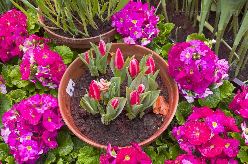 Ярко-красные тюльпаны в окружении цветущей примулы. на традиционной ежегодной выставке "Репетиция весны" в в Аптекарском Огороде (филиал ботанического сада МГУ). Москва