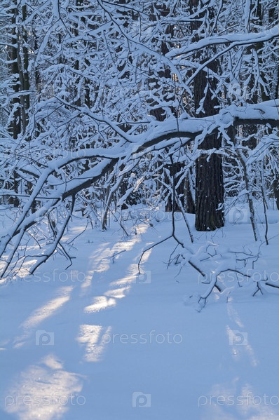 Зимний лес. Ветки деревьев, покрытые снегом. Солнечный день в январе