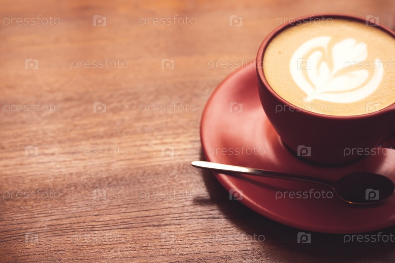 Утренний кофе в красной кружке на деревянном столе в кафе, латте-арт розетта