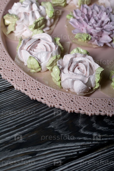 Цветы зефира на подносе. Бутоны зефира. Домашние сладости. На фоне сосновых досок. Снято крупным планом
