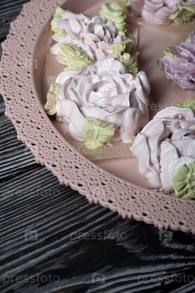 Цветы зефира на подносе. Бутоны зефира. Домашние сладости. На фоне сосновых досок. Снято крупным планом