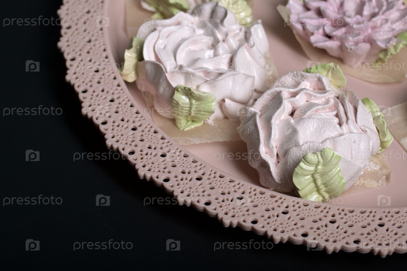 Цветы зефира на подносе. Бутоны зефира. Домашние сладости. На черном фоне. Снято крупным планом