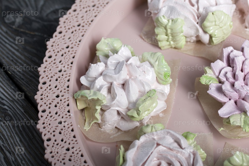 Цветы зефира на подносе. Бутоны зефира. Домашние сладости. На фоне сосновых досок. Снято крупным планом