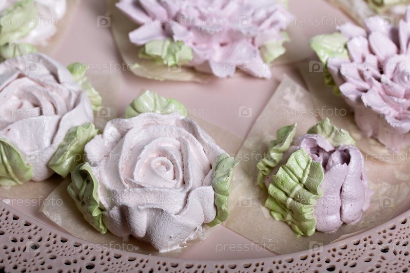 Цветы зефира на подносе. Бутоны зефира. Домашние сладости. На фоне сосновых досок. Снято крупным планом
