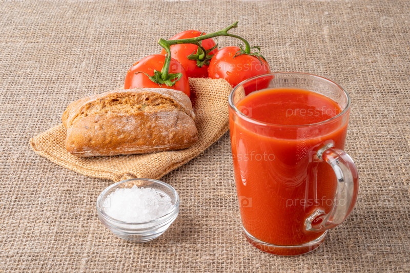 Томатный сок, томаты на ветке, традиционный хлеб