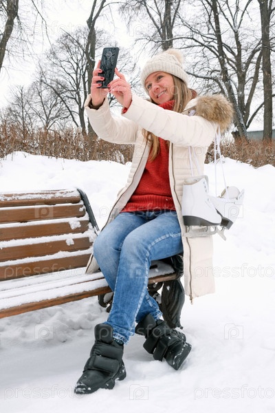 Молодая женщина делает селфи на смартфоне с зимними коньками. Виртуальное общение на улице. Зима