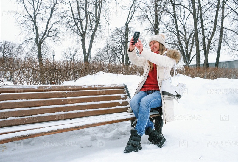 Молодая женщина делает селфи на смартфоне с зимними коньками. Виртуальное общение на улице. Зима