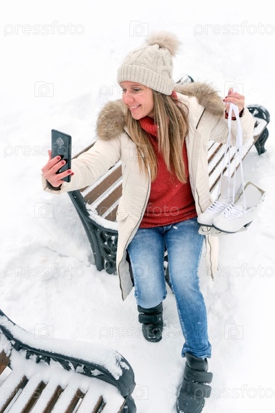 Молодая женщина делает селфи на смартфоне с зимними коньками. Виртуальное общение на улице. Зима