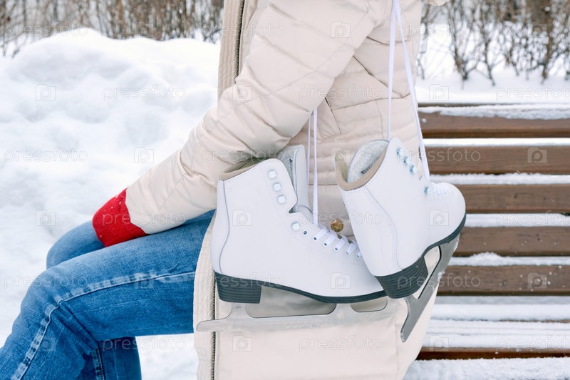 Молодая счастливая женщина надевает коньки. Зимний вид спорта. Кататься на коньках. Зима