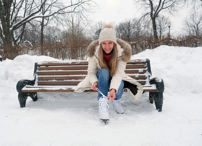 Молодая счастливая женщина надевает коньки. Зимний вид спорта. Кататься на коньках. Зима