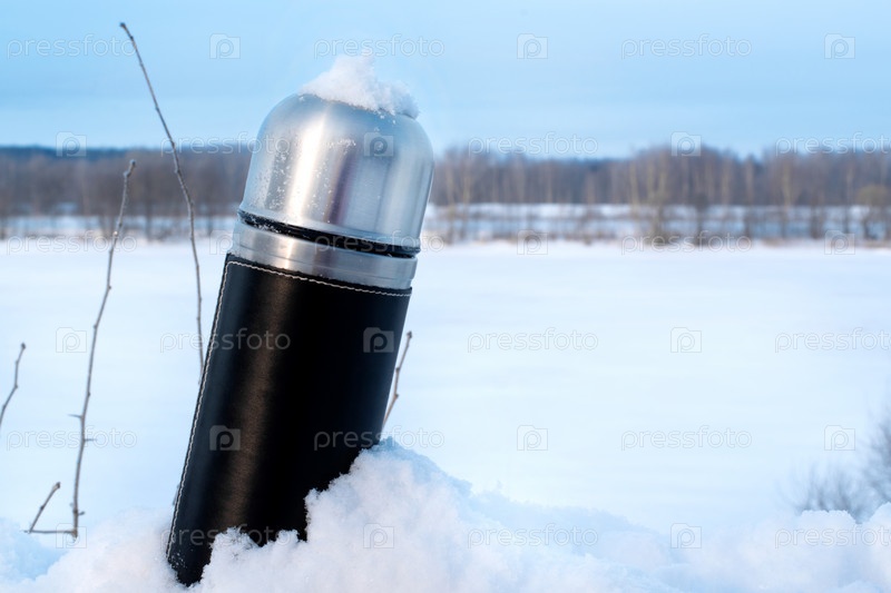 Железный термос в снегу на фоне ледяной реки в солнечный день. Зимнее путешествие
