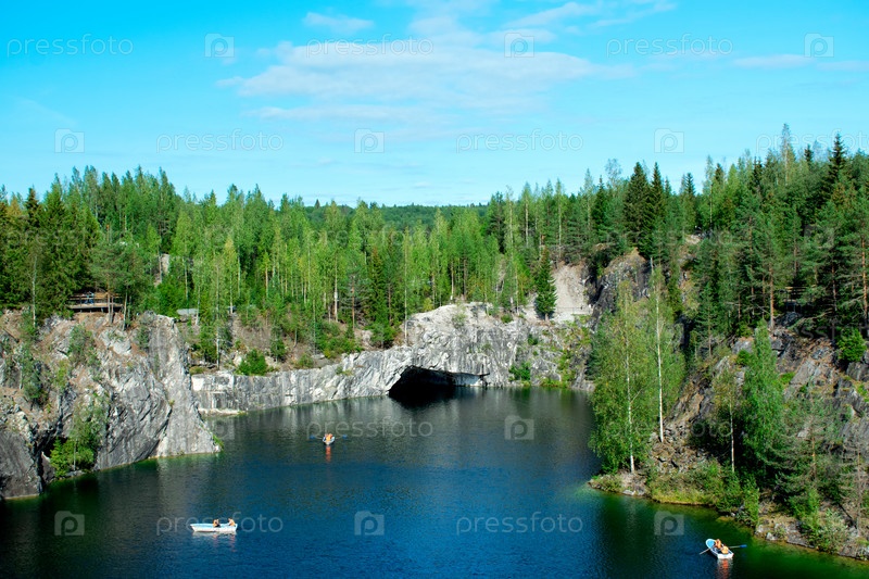 Мраморный карьер с озером в парке Рускеала в солнечный день. Карельский пейзаж