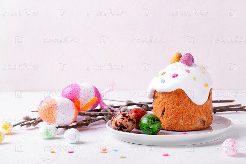 Пасхальная композиция на белом столе. Пасхальный кулич с глазурью из зефира и разноцветной посыпкой подается на керамической тарелке с шоколадными яйцами