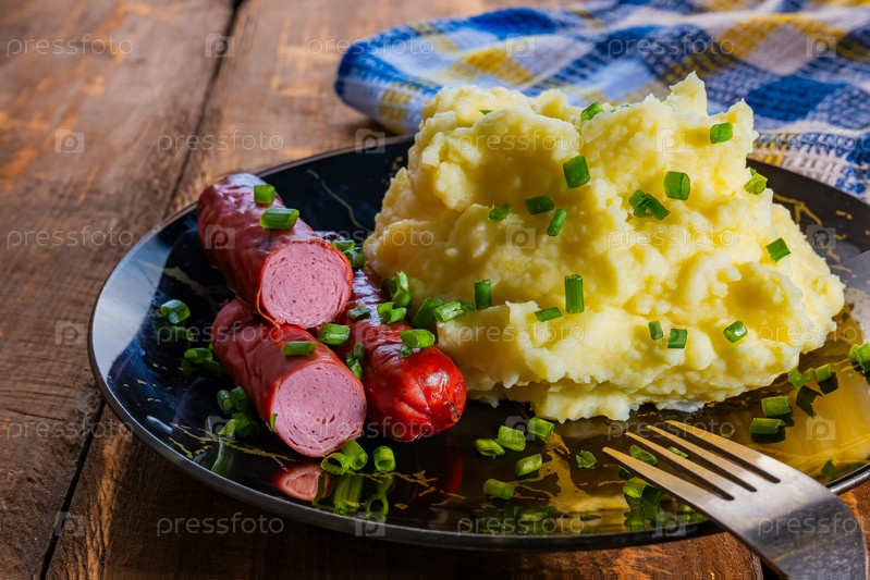 Картофельное пюре с сосиской и зеленым луком