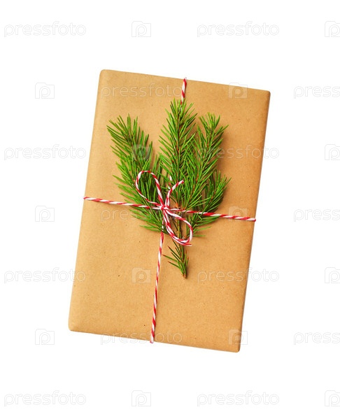 Новогодняя подарочная коробка, упакованная своими руками, украшенная еловой веткой, изолированная на белом фоне