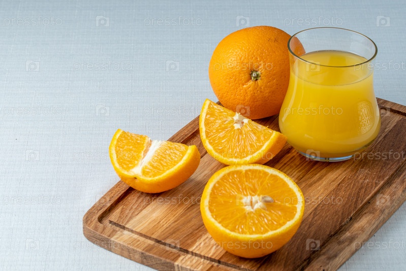 Свежевыжатый апельсиновый сок, нарезанный апельсин