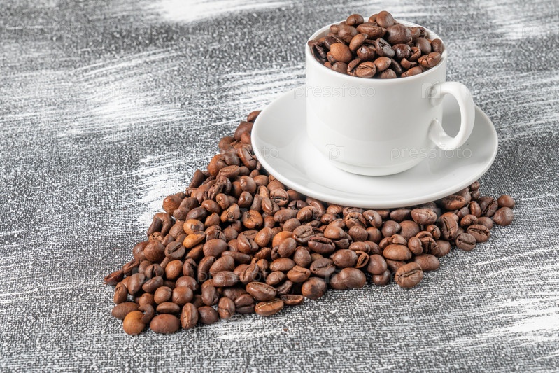 Кофейная чашка с кофейными зернами на текстурированном сером фоне