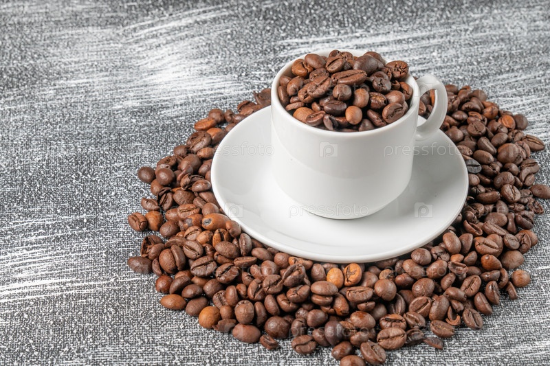 Кофейная чашка с кофейными зернами на текстурированном сером фоне