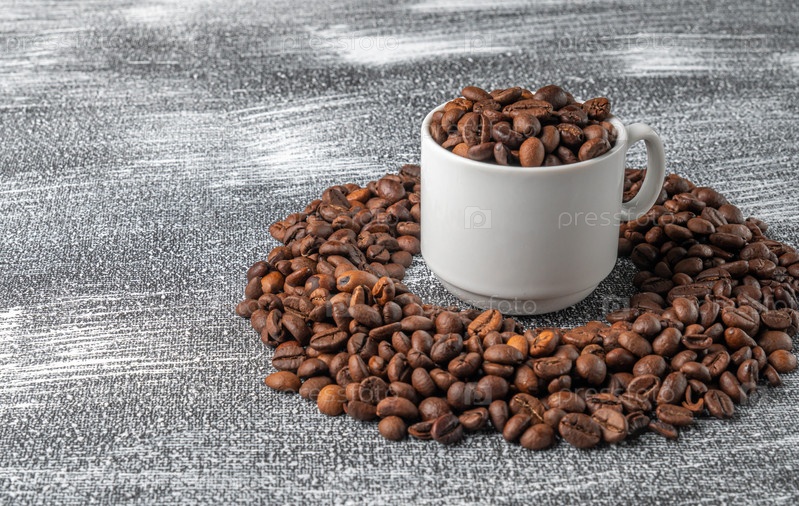 Кофейная чашка с кофейными зернами на текстурированном сером фоне