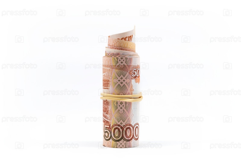 Свернутые пятитысячные купюры на белом. Рулон российской валюты