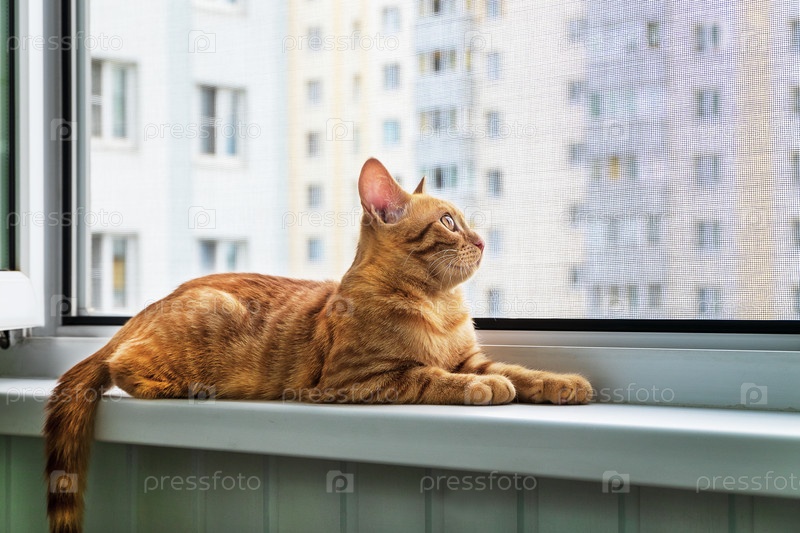 Рыжий полосатый котенок лежит на подоконнике. Антимоскитная антивандальная защитная сетка от кошек