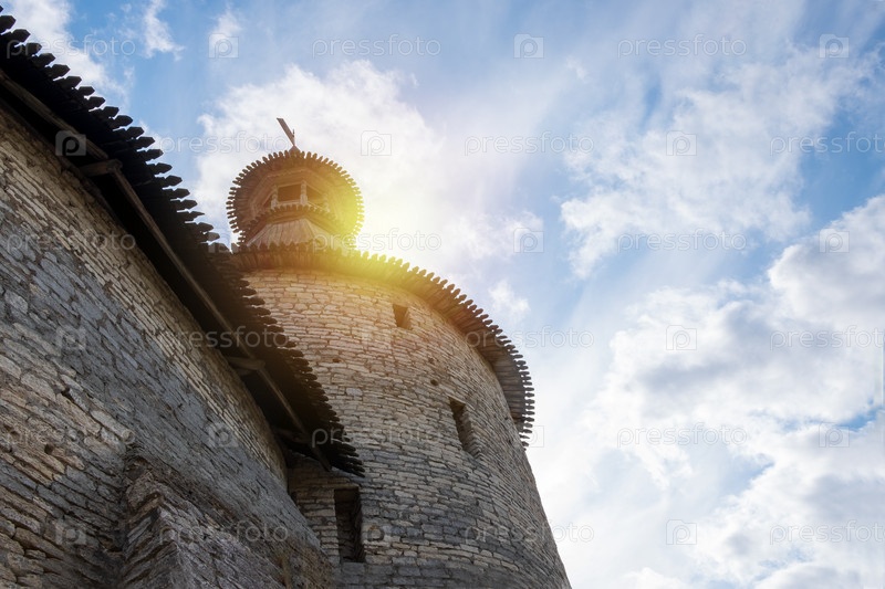 Древняя стена средневековой крепости Кремль с башней