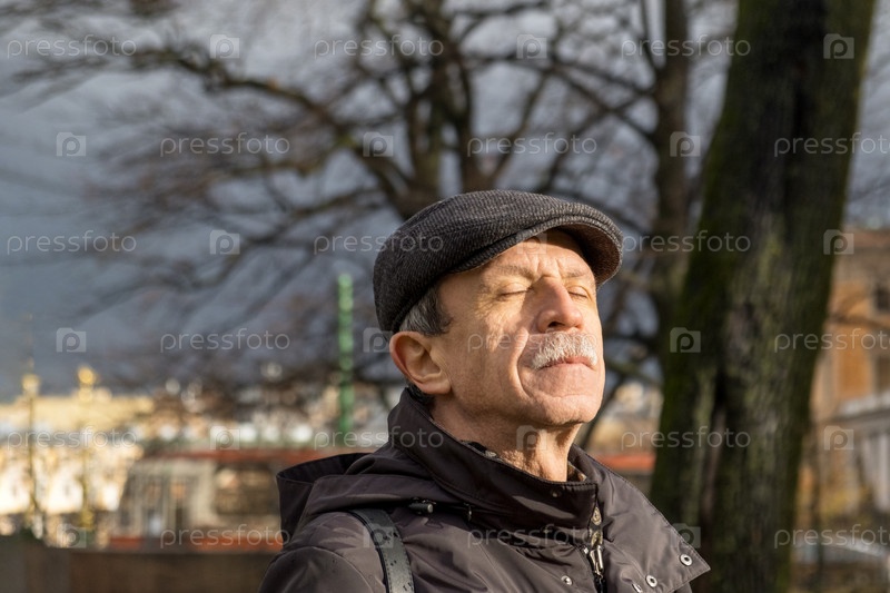 Взрослый мужчина пенсионного возраста стоит в парке поздней осенью и подставляет солнечные лучи