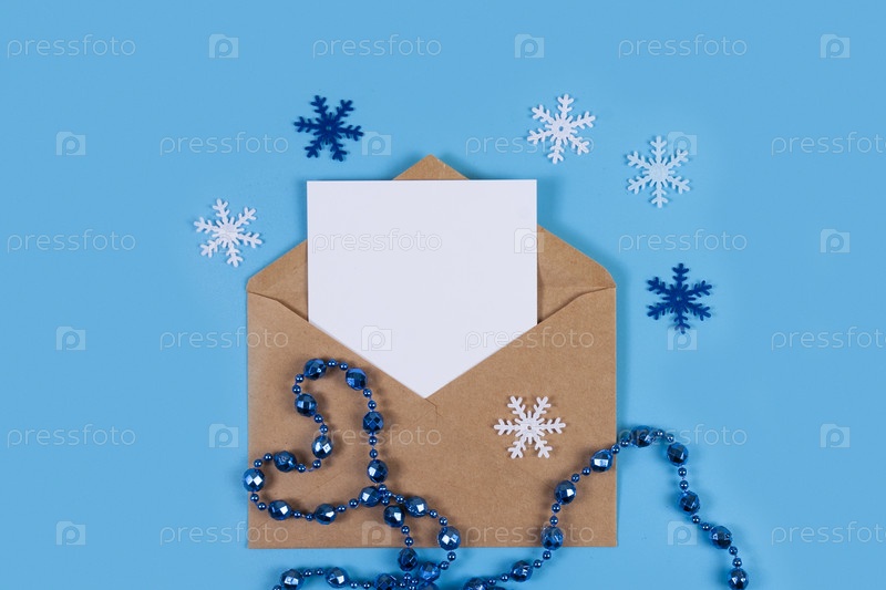 Рождественская композиция. Рождественские украшения и конверт на синем фоне