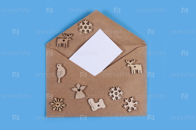 Рождественская композиция. Деревянные рождественские украшения и конверт на синем фоне