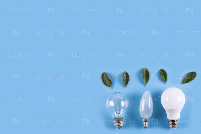 Три лампочки со свежими зелеными листьями на синем фоне