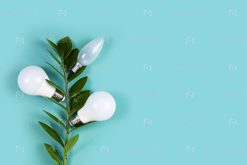 Лампочки со свежими листьями на зеленом фоне