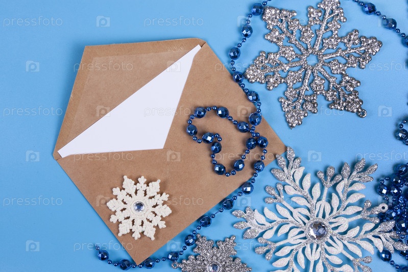 Рождественская композиция. Рождественские украшения и конверт на синем фоне