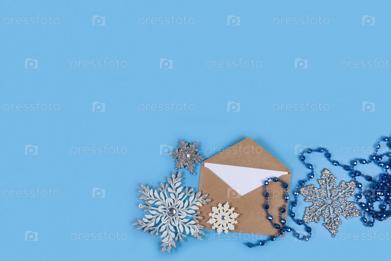 Рождественская композиция. Рождественские украшения и конверт на синем фоне