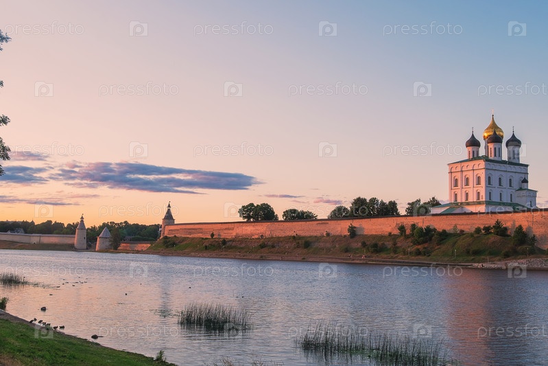 Вид на стены древнего Псковского Кремля и Троицкого собора