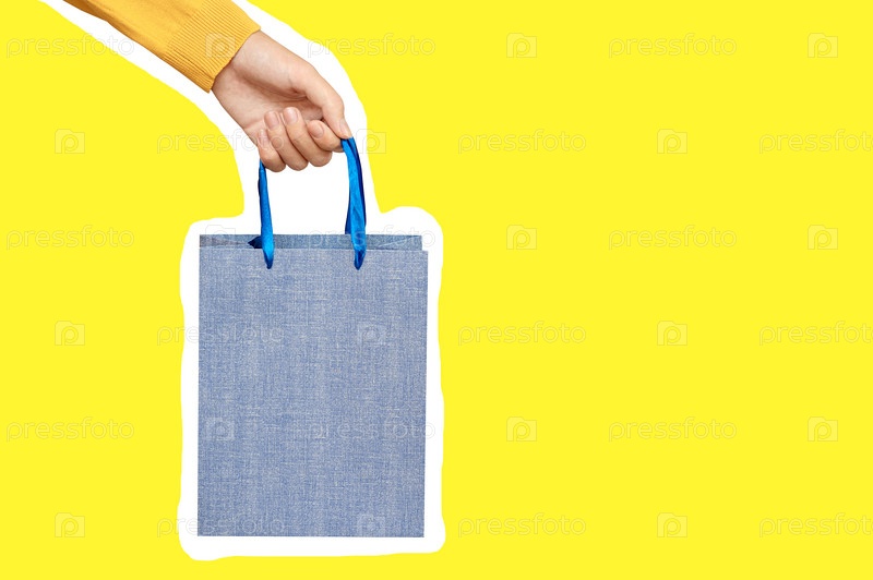 Рука держит пустые бумажные пакеты для рекламного шаблона макета и брендинга на желтом фоне. Шопинг, продажи