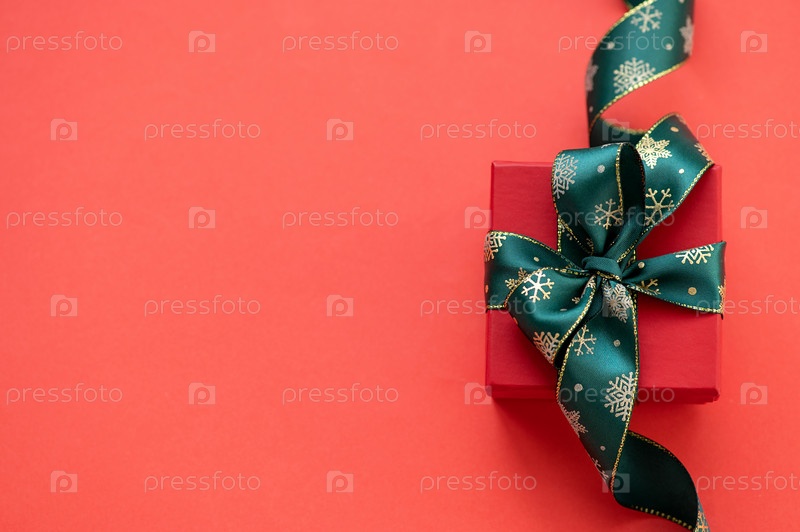 Красная подарочная коробка с зеленым бантом на красном фоне. Рождественский подарок. Вид сверху. Место для текста. Праздничная открытка