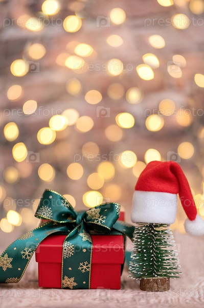 Красный подарок и рождественская елка в шляпе деда Мороза на фоне ярких огней, вертикальное фото