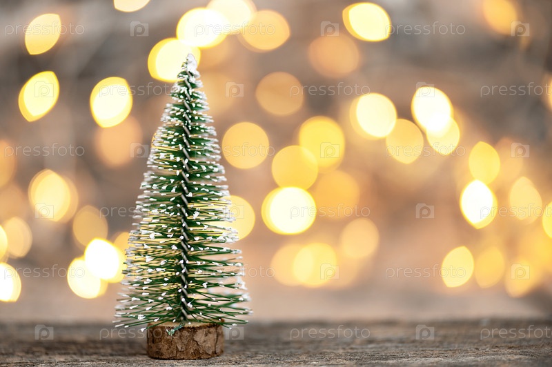 Рождественская елка на деревянном столе на фоне размытых огней