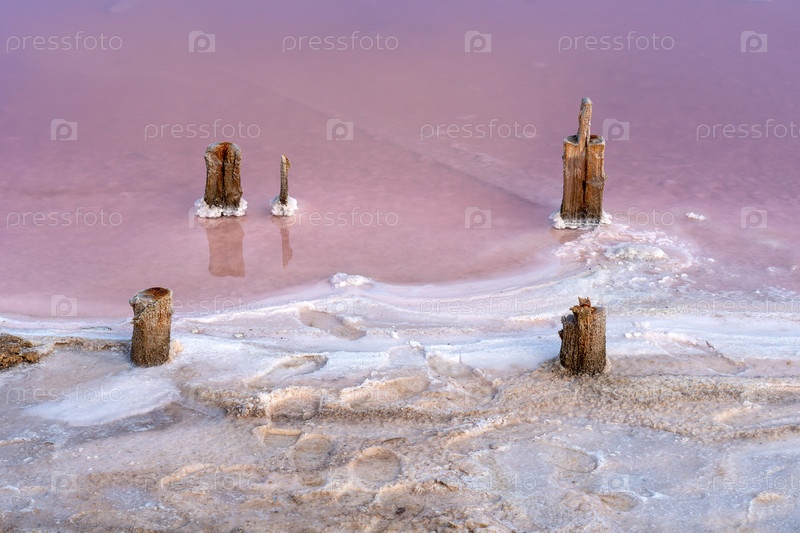 Кристаллы соли, следы туристов на розовом озере, где добывают соль