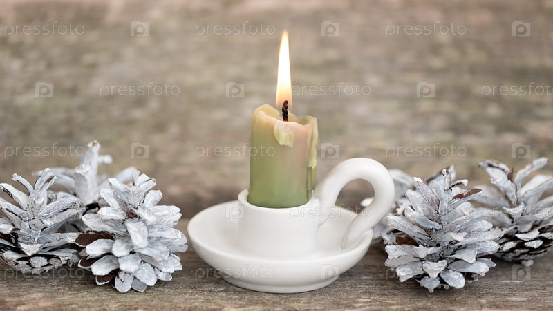 Свеча рождественских украшений на подсвечнике и сосновых шишках на деревянном фоне