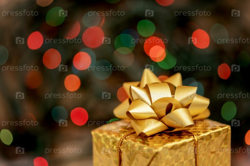 Новогодний подарок крупным планом на фоне размытых огней