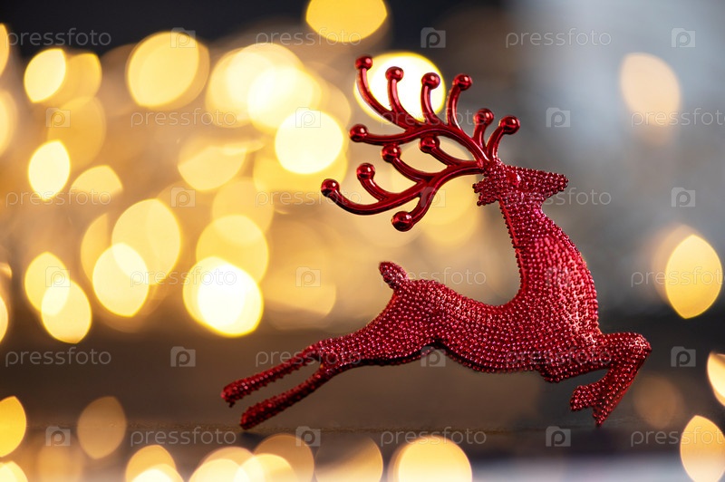 Рождественский красный олень на темном фоне и расфокусированные огни боке