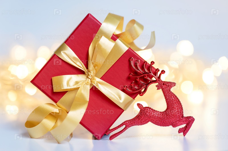 Рождественский фон. Красный олень и красная подарочная коробка на фоне расфокусированных огней боке