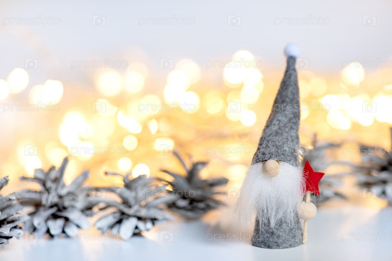 Рождественский гном с праздничными украшениями на фоне заснеженных еловых шишек