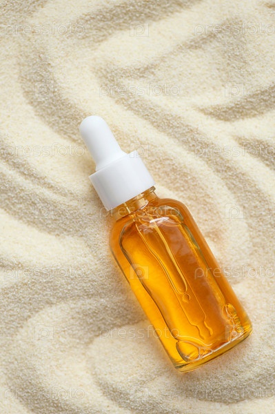 Сыворотка для лица на абстрактном фоне песчаной текстуры. вертикальное фото