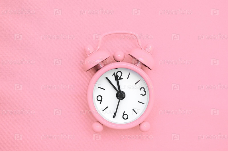 Розовый будильник на розовом фоне. Концепция времени