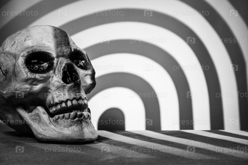 Череп на сером фоне с подиумом и абстрактными размытыми светлыми полосами в форме арки. Выборочный фокус. Пространство для надписей, дизайна и презентации
