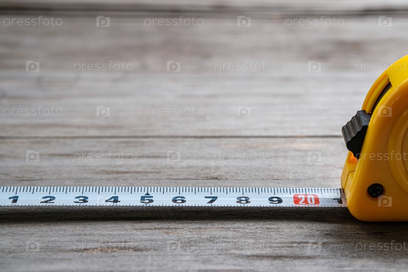 Измерительная лента растянулась на 21 см с размытым деревянным фоном. Крупный план. Выборочный фокус
