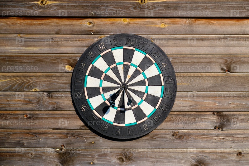 Старая ветхая доска для дартса на деревянной стене. Выборочный фокус. Место для надписей и дизайна