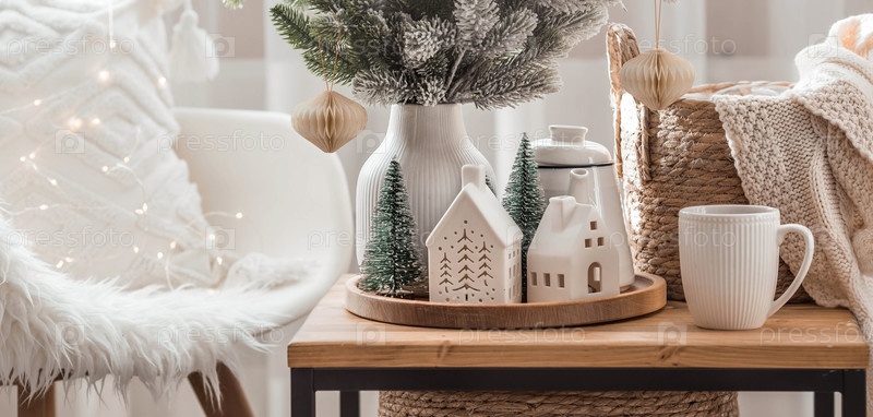 Букет елок, плед в плетеной корзине и скандинавские белые домики и кружка кофе на деревянном столе в домашнем интерьере гостиной. Уютная концепция праздничного оформления